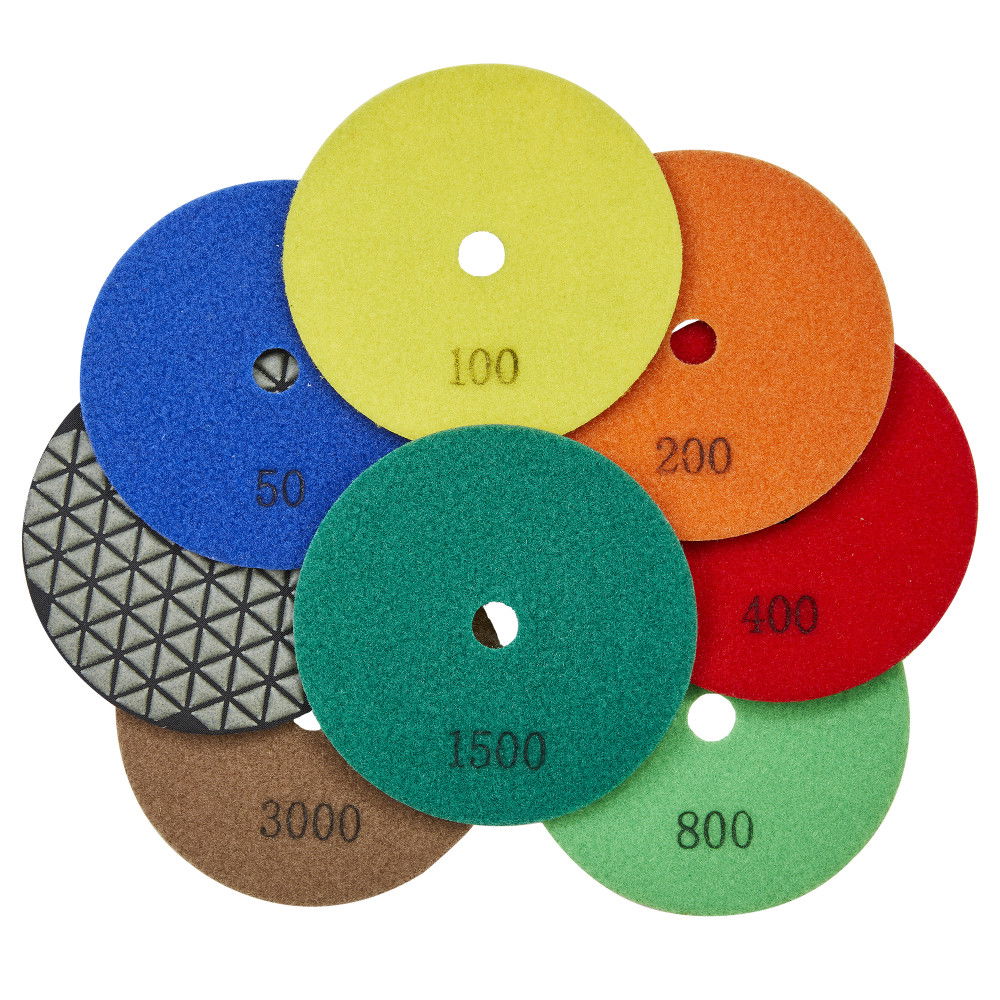 Jellemzők: Kiváló minőségű, gyémánt tartalmú beton polírozó tárcsa. Prémium anyagokból készül, ami hatékony csiszolást és polírozást biztosít. Ideális száraz környezetben történő használatra. A termék többféle szemcseméretben rendelhető, Grit 50-től 3000-ig. Az 50-es a legdurvább szemcse, amely fokozatosan finomodik, ahogy a Grit szám növekszik.