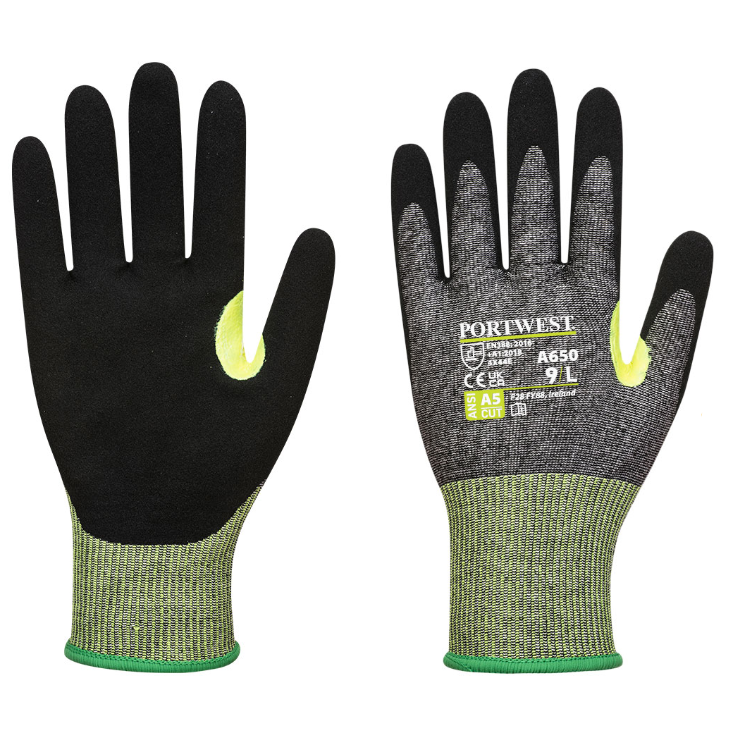 E szintű vágásbiztos kesztyű nitrilhab bevonattal a kiváló tapadásért nedves és száraz körülmények között. A megerősített hüvelykujj extra tartósságot biztosít. A légáteresztő 15 kötési sűrűségű bélés kiváló fogásbiztonságot nyújt viselőjének. Alkalmas érintőképernyős eszközökkel való használatra. A fényvisszaverő címke növeli a kesztyű láthatóságát gyenge fényviszonyok között.