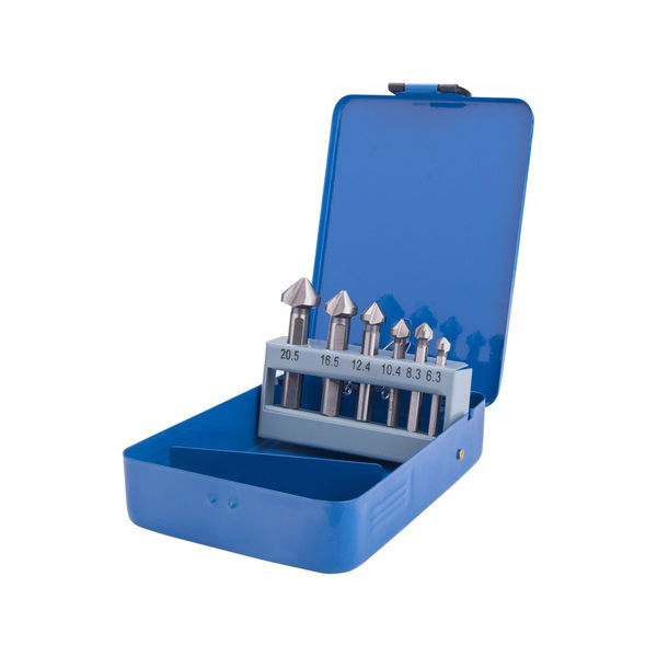 EXTOL Kúpos süllyesztő készlet 6db, 90 fokos, 3 élű; 6,3-8,3-10,4-12,4-16,5-20,5mm, 1/4" háromszög befogás, HSS acél, fém doboz